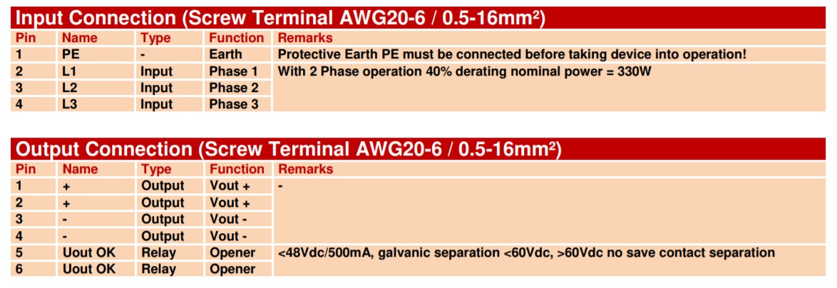 Output Screw Terminal 4x AWG20 – AWG6 / 0,5 – 16mm² (+ + / - - ) |